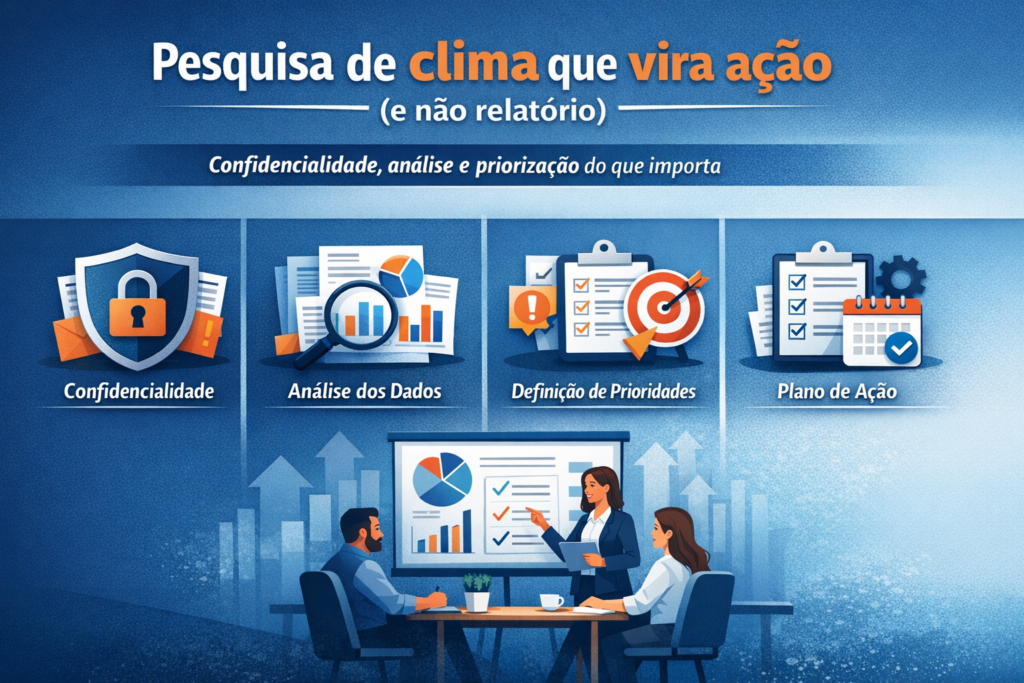 Uma pesquisa de clima que vira ação é aquela que protege a confidencialidade, interpreta os dados com profundidade e transforma resultados em prioridades executáveis — com governança e comunicação.